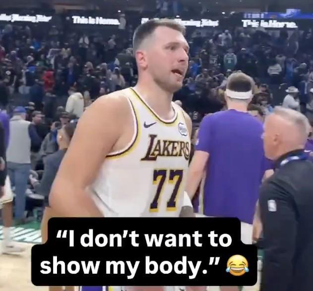 比赛结束后,独行侠球员纳吉-马绍尔找到湖人队球员东契奇,希望能与他交换球衣,而东契奇表示:“嘿,纳吉,一会儿回去我再给你球衣,因为我不想在这露出我的身体。”